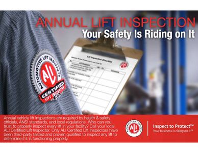 inspections lift 25t11 No Hassle Lift Inspections Performed by the Best Inspectors. Remember, your safety is riding on it. Can apply serialized ALI Certified Lift Inspection Program labels to every lift they inspect. lift inspection inspector faq certification automotive The ALI Lift Certification Program is the only accredited program in North America to independently test and validate that a car lift model meets all ANSI/ALI ALCTV safety and performance requirements. Lifts can be tested and certified regardless of where they are manufactured and whether or not the manufacturer is an ALI member. The report is signed by the shop manager or person having authority. They are available to inspect customer lifts now, providing a trustworthy resource for shop owners across the country..